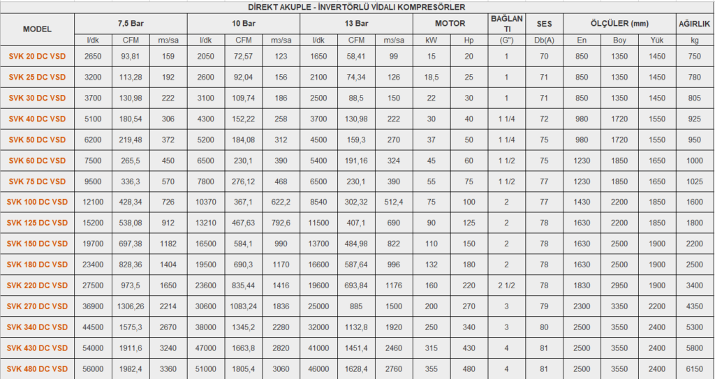 Ürün kodunda “DC” harfleri bulunan modeller Direkt Akuple Vidalı Kompresörleri ifade eder.